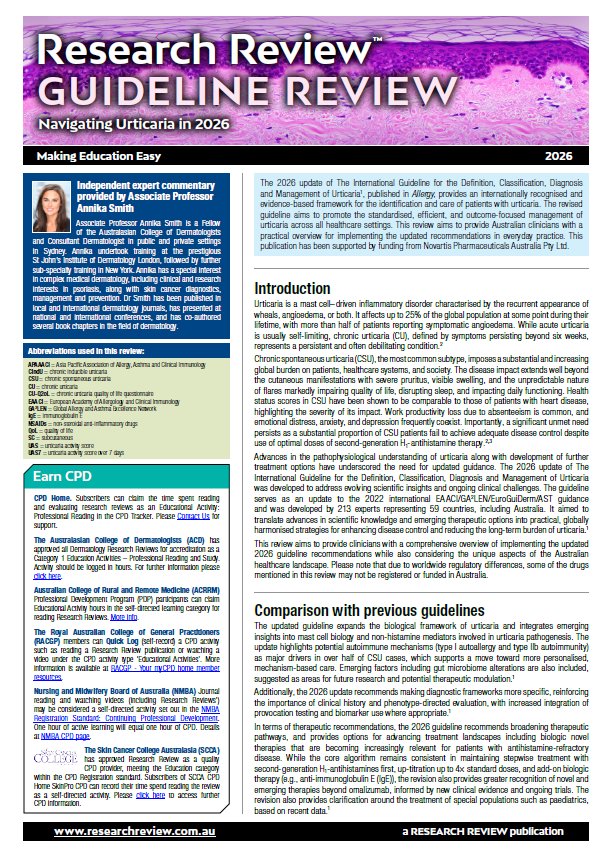 Welcome to our new Research Review publication, Guideline Review. With frequent changes to international guidelines to accommodate new advances, we’ve attached our summary of the 2026 update of The International Guideline for the Definition, Classification, Diagnosis and Management of Urticaria. View this issue online [[insert online version link here]]here.