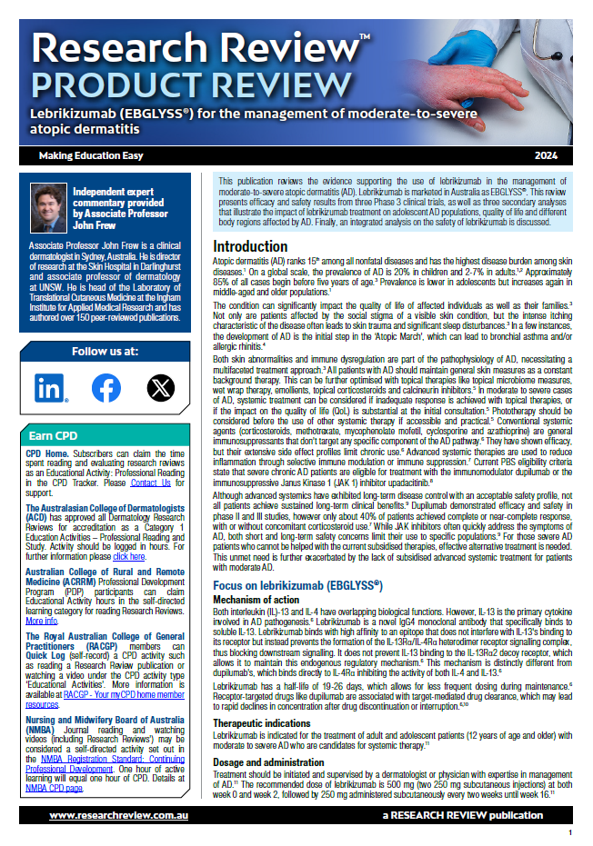 This review discusses indications and dosage, contraindications and a series of clinical studies featuring lebrikizumab use to treat atopic dermatitis. It provides commentary from Associate Professor John Frew, clinical dermatologist, director of research at the Skin Hospital in Darlinghurst and associate professor of dermatology at UNSW.