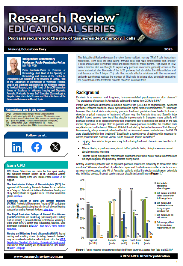 This review discusses the role of tissue-resident memory T cells in psoriasis recurrence. It also includes guiding commentary from Pablo Fernández-Peñas, Professor of Dermatology, Joint Head of the Specialty of Dermatology and Director of the Centre for Translational Skin Research at the University of Sydney and Head of the Department of Dermatology at Westmead Hospital.
