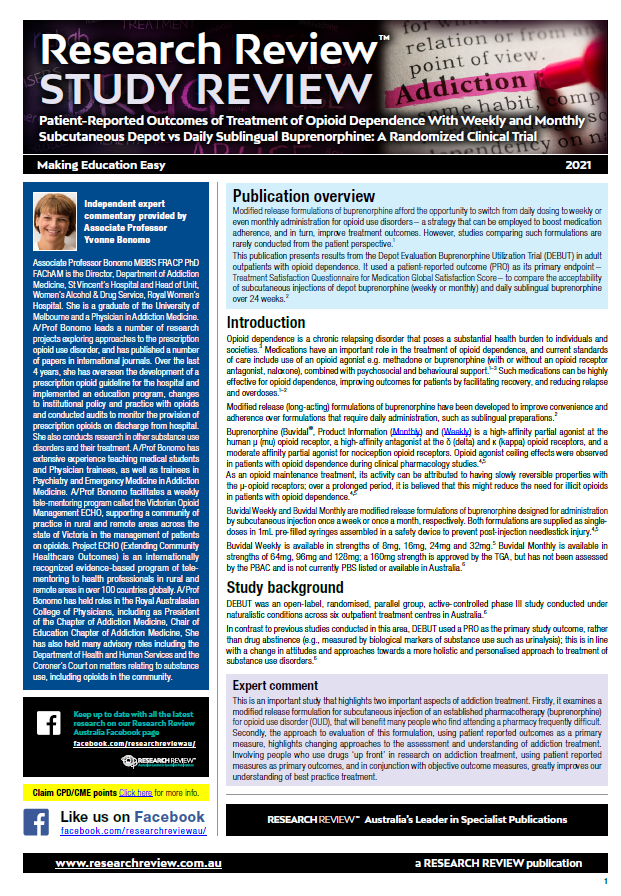 As part of our ongoing aim to bring you reports of interesting new studies, we have added a review of results from the Depot Evaluation Buprenorphine Utilization Trial (DEBUT) in adult outpatients with opioid dependence.