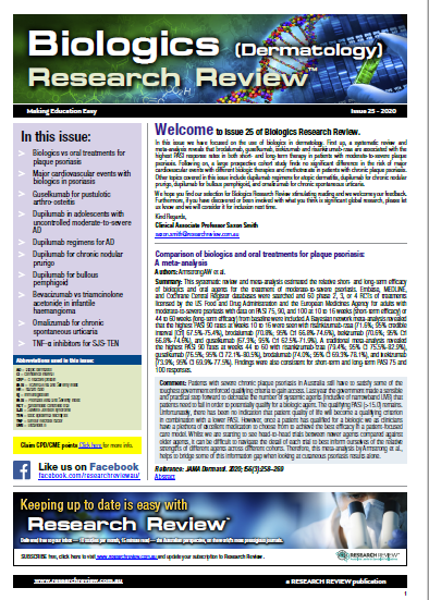 This Review features key medical articles from global journals with commentary from Dr Annika Smith. The Review covers topics such as biologics, biosimilars and the disease areas treated by biological medicines.