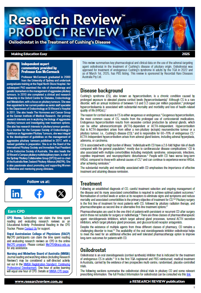 As part of our series focussing on medicines available in Australia, we have added a product review of the use of osilodrostat to treat Cushing’s Disease.