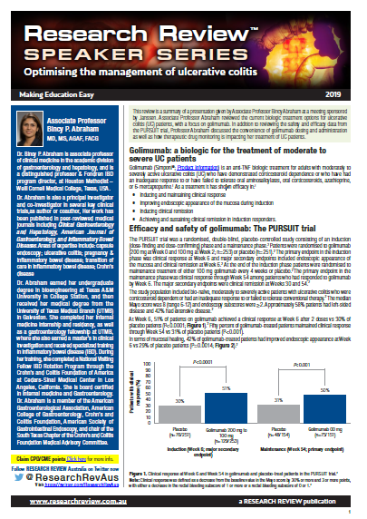 This review is a summary of a recent speaker event presented by Associate Professor Bincy Abraham titled ‘Optimising the management of ulcerative colitis’.