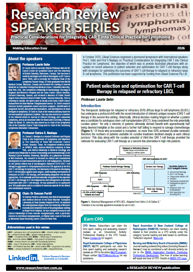 This Speaker Series on ‘Practical Considerations for Integrating CAR T into Clinical Practice for Lymphoma’ was a sponsored symposium with international speakers Professor Laurie Sehn and Professor Sattva Neelapu, the objective of which was to provide Australian physicians with an update on recent advances in patient selection and optimisation for CAR T-cell therapy along with strategies for optimising the outcomes of CAR T-cell therapy in relapsed or refractory large B-cell lymphoma.