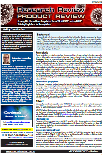 This article overviews the pharmacological properties and clinical efficacy and tolerability of ADVATE in the context of personalised prophylaxis for haemophilia A facilitated by myPKFiT, which is a software tool for clinicians that predicts individual pharmacokinetic profiles for patients and calculates an appropriate ADVATE prophylaxis dosing regimen.