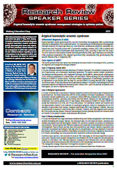 This review is a summary of a recent talk by Professor Arif Asif, Professor and Chairman of the department of Medicine at Jersey Shore University Medical Center. Professor Asif briefly reviewed the differential diagnosis of atypical haemolytic uraemic syndrome (aHUS) and presented clinical evidence for its management.
