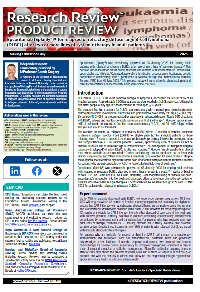 As part of our series focussing on medicines available in Australia, we have added a product review which outlines the pharmacology, clinical characteristics and clinical trial data of epcoritamab for relapsed or refractory diffuse large B-cell lymphoma (DLBCL) after two or more lines of systemic therapy in adult patients.