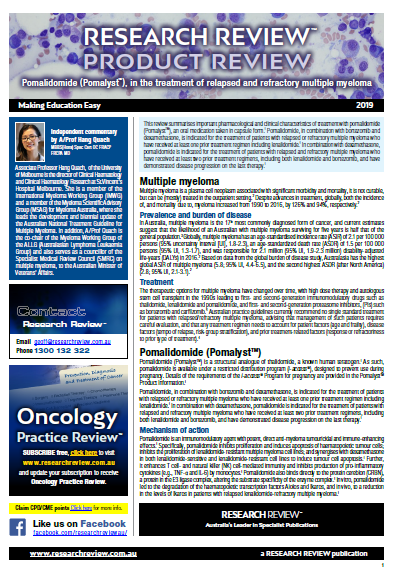 This review summarises important pharmacological and clinical characteristics of treatment with pomalidomide, an oral medication taken in capsule form.