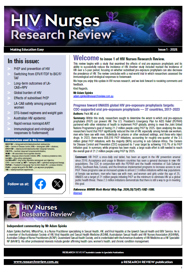 This Review features key medical articles from global journals with commentary from Adam Spinks, a Nurse Practitioner specialising in Sexual Health, HIV, and Viral Hepatitis at Ipswich Sexual Health and BBV Service. The Review covers topics such as treatment safety in pregnancy, discussion on pre-exposure prophylaxis, prevalence and future burden of HIV , safety and efficacy of new and existing treatments, and many other relevant topics.