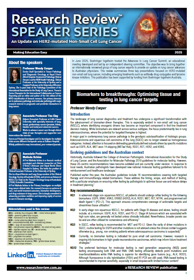 This review summarises three key presentations focused on HER2-mutated non-small cell lung cancer from the Advances in Lung Cancer Summit, an educational meeting developed and led by an independent steering committee. Speakers included Professor Wendy Cooper, Associate Professor Tim Clay and Associate Professor Malinda Itchins.
