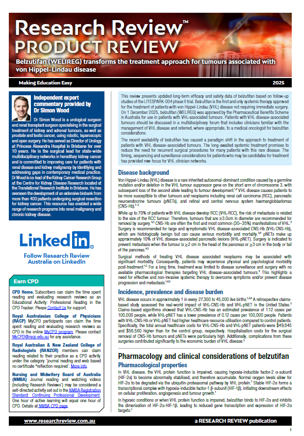 As part of our series focussing on medicines available in Australia, this review presents updated long-term efficacy and safety data of belzutifan based on follow-up studies of the LITESPARK-004 phase II trial.