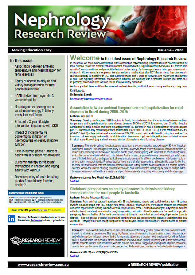 This Review features key medical articles from global nephrology journals with commentary from Professor David Mudge and Drs Emily See and Sradha Kotwal. The Review covers topics such asperitoneal dialysis, acute renal failure, diabetic nephrology, renal osteodystrophy, autoimmune kidney disease, transplant rejection, immunosuppression and monoclonal antibodies.