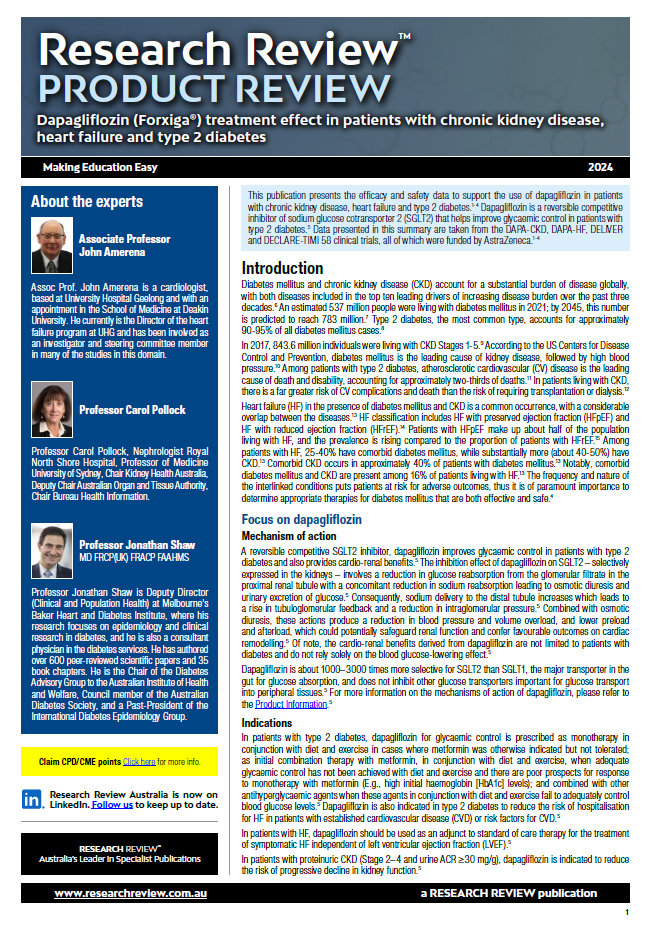 As part of our series focussing on medicines in Australia, we have added a product review of the use of dapagliflozin in patients with chronic kidney disease, heart failure and type 2 diabetes.