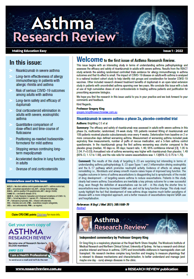 Professor Gregory King. The Review covers topics such as eosinophilic asthma, allergic rhinitis, COVID-19 outcomes, and news on advancing treatments for asthma.