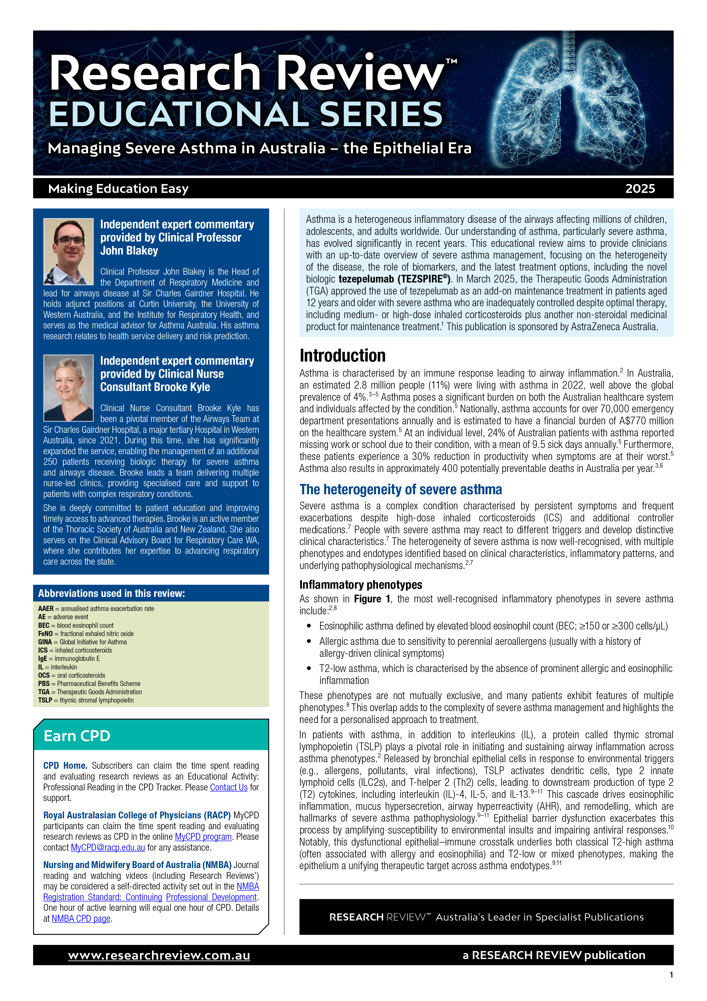 This educational review provides an up-to-date overview of severe asthma management, focusing on the heterogeneity of the disease, role of biomarkers, and the latest treatment options, including the novel biologic tezepelumab. It also includes guiding commentary from Clinical Professor John Blakey, Head of the Department of Respiratory Medicine, and Clinical Nurse Consultant Brooke Kyle both based at Sir Charles Gairdner Hospital.