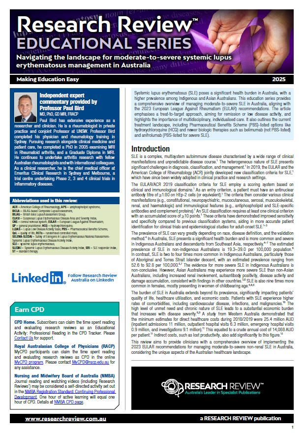 This educational series provides a comprehensive overview of managing moderate-to-severe SLE in Australia, aligning with the 2023 European League Against Rheumatism (EULAR) recommendations. It also includes guiding commentary from Professor Paul Bird, a rheumatologist in private practice and conjoint Professor at UNSW.