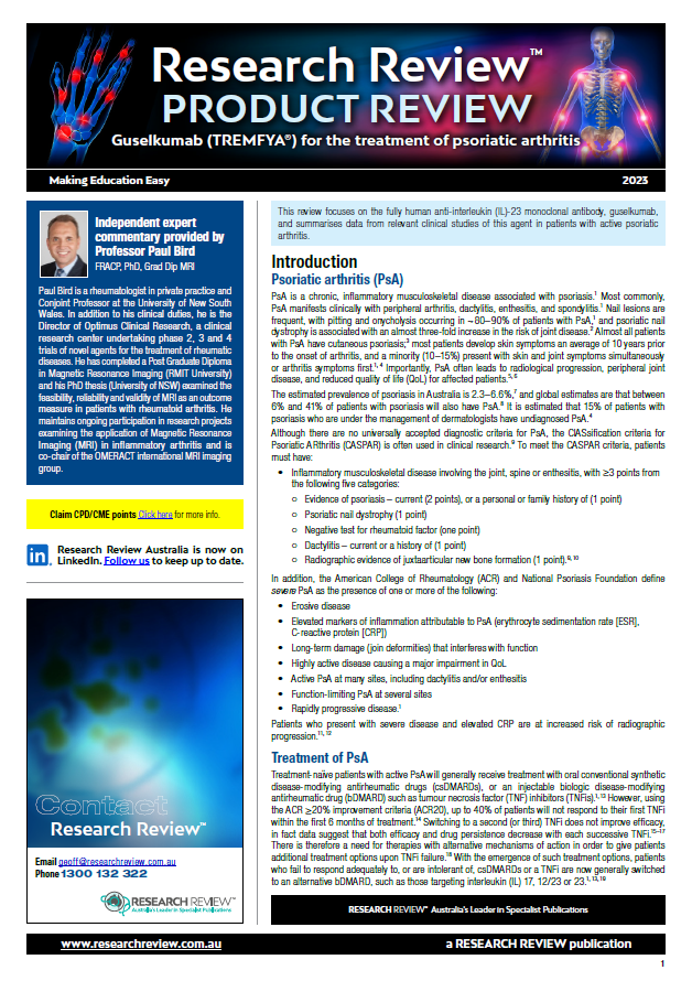This review discusses psoriatic arthritis, currently available treatments, indications and dosage, contraindications and a series of clinical studies featuring guselkumab use. It also provides commentary from Professor Paul Bird, a rheumatologist in private practice and Conjoint Professor at the University of New South Wales.