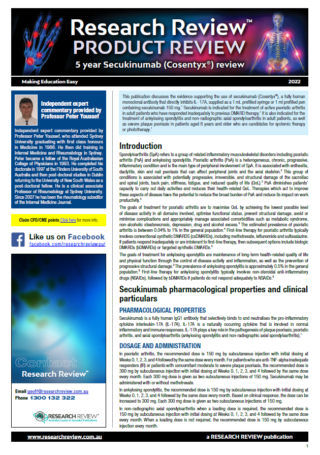 This review discusses pharmacological properties, mechanism of action and major studies featuring Secukinumab. It also provides commentary and recommendations from Professor Peter Youssef, who is clinical associate Professor of Rheumatology at Sydney University.