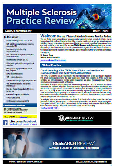 This Review features key medical articles from global neurology journals with commentary from Clinical A/Prof Todd Hardy. The Review covers topics such as multiple sclerosis, inflammatory disease, treatment guidelines, relapses, stem cell therapy, physical therapy, pain management and disease-modifying drugs.