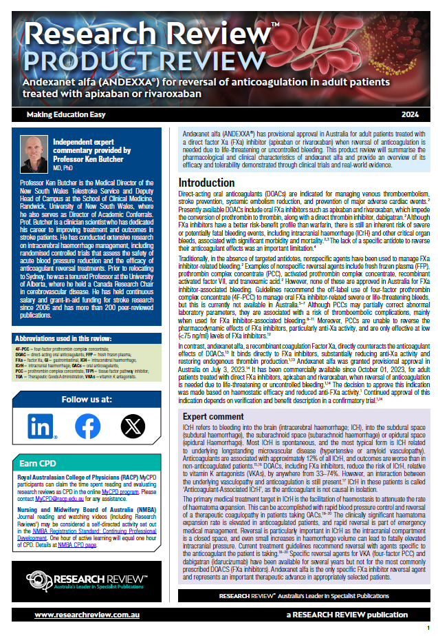As part of our series focussing on medicines in Australia, we have added a product review of the use of andexanet alfa for reversal of anticoagulation in adult patients treated with apixaban or rivaroxaban. This review summarises the pharmacological and clinical characteristics of andexanet alfa and efficacy and tolerability through clinical trials and real-world evidence.