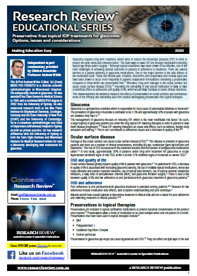 This Educational Series focusses on preservative-free topical IOP treatments for glaucoma: options, issues and considerations. This review covers efficacy and tolerance of current treatments, mechanism of action and key clinical studies.