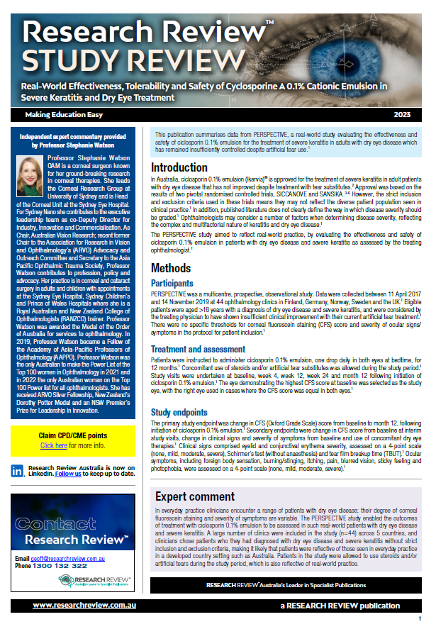 As part of our ongoing aim to bring you reports of innovative developments, we have added a review of the Perspective Study; a real-world effectiveness, tolerability and safety of Cyclosporine A 0.1% cationic emulsion in severe keratitis and dry eye treatment.