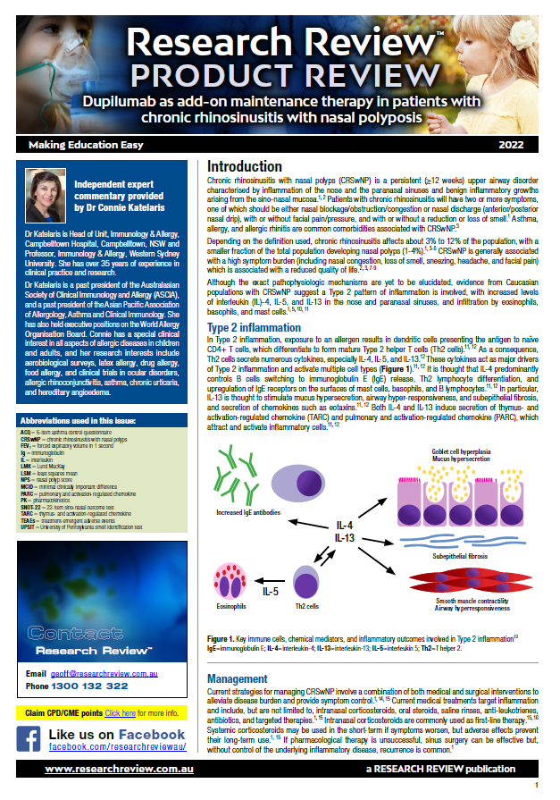 As part of our ongoing series focussing on new registrations in Australia, we have added a product review of the use of Dupilumab as add-on maintenance therapy in patients with chronic rhinosinusitis with nasal polyposis.
