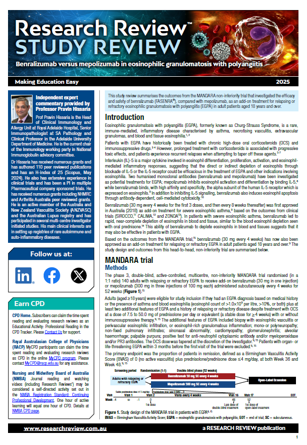 Independent commentary for the review has been provided by Professor Pravin Hissaria, Head of the Clinical Immunology and Allergy Unit at Royal Adelaide Hospital, Senior Immunopathologist at SA Pathology and Clinical Professor in the Adelaide University Department of Medicine.