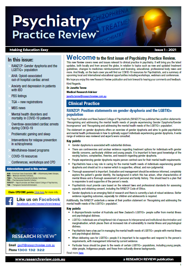 The Royal Australian and New Zealand College of Psychiatrists (RANZCP) CPD Program allows participants to claim hours spent in private reading of journals under 'Section 4 - Self Guided Learning'. Research Reviews can be included as ‘Self-Guided Learning’.