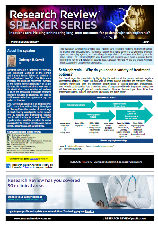 The presentation was made by Christoph Correll, a Professor of Psychiatry and Molecular Medicine at the Donald and Barbara Zucker School of Medicine in New York, USA. Discussion focussed on treating across the schizophrenia symptom spectrum, managing agitation, and determining the right choice of treatment with the long term in mind.