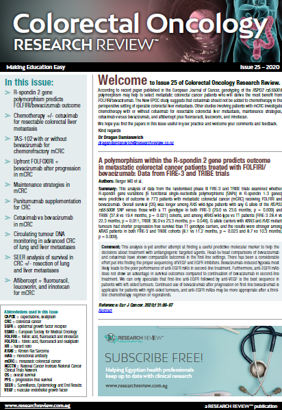 This Review features key medical articles from global journals. The Review covers topics such as adenocarcinoma, metastatic colorectal cancer, adenomatous polyps, risk factors, screening guidelines, sigmoidoscopy, laparoscopic surgery and adjuvant therapy.