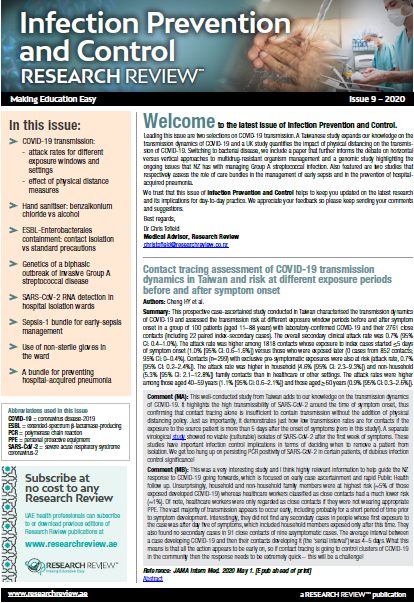 This Review features key medical articles from global journals. The Review covers topics such as MRSA infection, nosocomial infection control, post-exposure prophylaxis, isolation protocols and healthcare epidemiology.