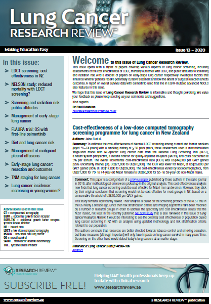 This review will bring you some of the most significant published research on lung cancer from around the world. Each issue contains an independent selection of papers chosen by medical specialists discussing what is relevant and how it can potentially influence current practice.