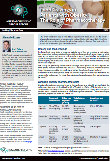 This review describes the issue of food cravings in patients with obesity, and the role that obesity pharmacotherapies can play in the management of this issue. Studies which have evaluated the effects of Medsafe-approved obesity pharmacotherapies on food cravings are discussed. This review has been created with an educational grant from Radiant Health.