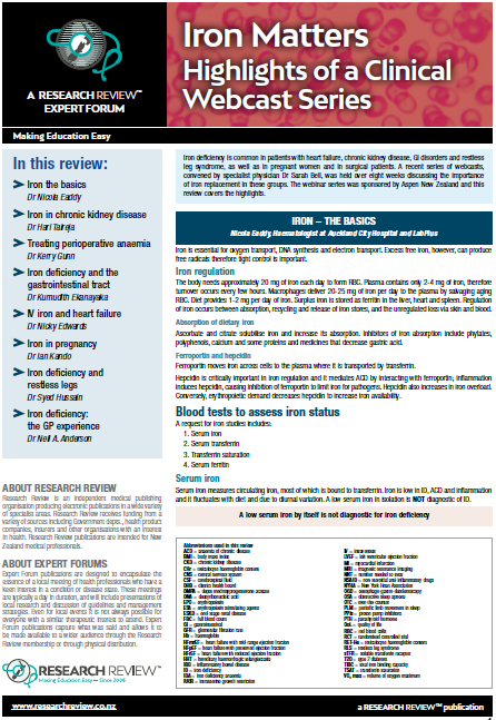 Iron deficiency is common in patients with heart failure, chronic kidney disease, GI disorders and restless leg syndrome, as well as in pregnant women and in surgical patients. A recent series of webcasts, convened by specialist physician Dr Sarah Bell, was held over eight weeks discussing the importance of iron replacement in these groups. The webinar series was sponsored by Aspen New Zealand and this review covers the highlights.
