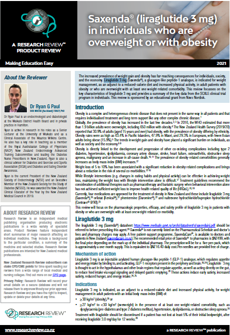 The increased prevalence of weight gain and obesity has far-reaching consequences for individuals, society, and the economy. Liraglutide 3 mg (Saxenda®), a glucagon-like peptide-1 analogue, is indicated for weight management, as an adjunct to a reduced-calorie diet and increased physical activity, in adult patients with obesity or who are overweight with at least one weight-related comorbidity. This review focusses on the key characteristics of liraglutide 3 mg and provides a summary of the key data from the SCALE clinical trial program in individuals. This review is sponsored by an educational grant from Novo Nordisk.