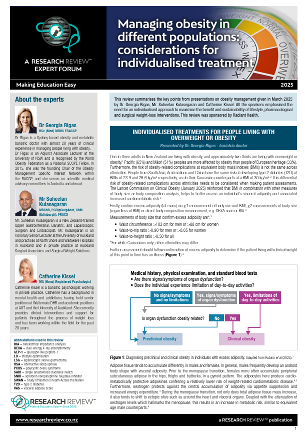 This review summarises the key points from presentations on obesity management given in March 2025 by Dr. Georgia Rigas, Mr. Suheelan Kulasegaran and Catherine Kissel. All the speakers emphasised the need for an individualised approach to maximise the benefit and sustainability of lifestyle, pharmacological and surgical weight-loss interventions. This review was sponsored by Radiant Health.