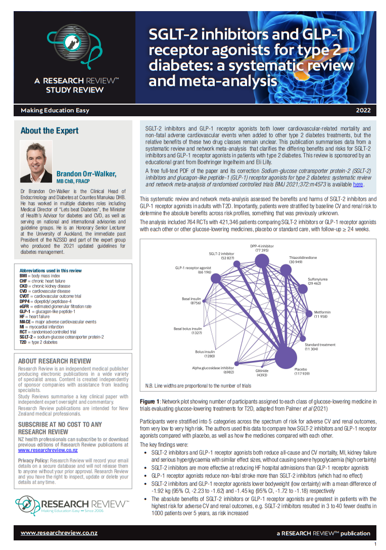 SGLT-2 inhibitors and GLP-1 receptor agonists both lower cardiovascular-related mortality and non-fatal adverse cardiovascular events when added to other type 2 diabetes treatments, but the relative benefits of these two drug classes remain unclear. This publication summarises data from a systematic review and network meta-analysis that clarifies the differing benefits and risks for SGLT-2 inhibitors and GLP-1 receptor agonists in patients with type 2 diabetes. This review is sponsored by an educational grant from Boehringer Ingelheim and Eli Lilly. A free full-text PDF of the paper and its correction Sodium-glucose cotransporter protein-2 (SGLT-2) inhibitors and glucagon-like peptide-1 (GLP-1) receptor agonists for type 2 diabetes: systematic review and network meta-analysis of randomised controlled trials BMJ 2021;372:m4573 is available here.