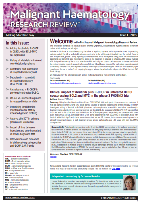 Multiple Myeloma Research Review is currently published in conjunction with Lymphoma and Leukaemia Research Review. Expert commentary for Lymphoma and Leukaemia Research Review is provided by Dr Leanne Berkahn.
