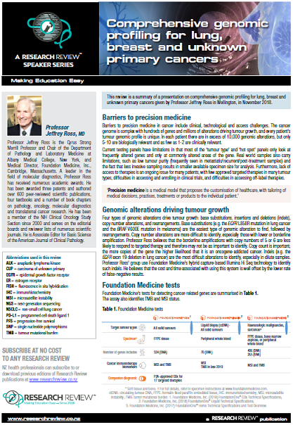 In this review: This review is a summary of a presentation on comprehensive genomic profiling for lung, breast and unknown primary cancers given by Professor Jeffrey Ross in Wellington, in November 2018.
