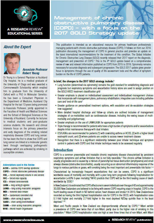 This publication is intended as an educational resource for primary healthcare professionals managing patients with chronic obstructive pulmonary disease (COPD). It follows on from our 2016 publication discussing the management of COPD in general practice and provides an update on the latest international recommendations for the treatment of this condition. The Global Initiative for Chronic Obstructive Lung Disease (GOLD) recently released their 2017 report on the diagnosis, management and prevention of COPD.1 This is the 4th GOLD update based on a comprehensive review of new and relevant information published on COPD from 2015 to 2016. Spirometry remains necessary for accurate diagnosis and subsequent progression. The GOLD 2017 update gives greater focus to symptoms through the use of quality of life assessment tools and the effect of symptom burden on the life of COPD patients.