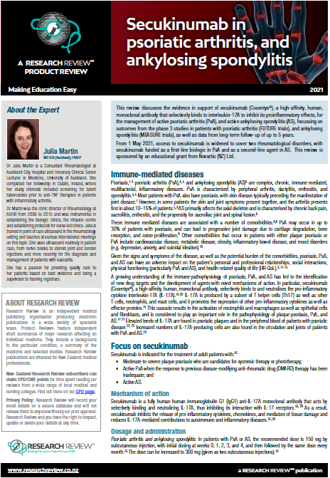 This review discusses the evidence in support of secukinumab (Cosentyx®), a high-affinity, human, monoclonal antibody that selectively binds to interleukin-17A to inhibit its proinflammatory effects, for the management of active psoriatic arthritis (PsA), and active ankylosing spondylitis (AS), focussing on outcomes from the phase 3 studies in patients with psoriatic arthritis (FUTURE trials), and ankylosing spondylitis (MEASURE trials), as well as data from long-term follow-up of up to 5 years. From 1 May 2021, access to secukinumab is widened to cover two rheumatological disorders, with secukinumab funded as a first-line biologic in PsA and as a second-line agent in AS. This review is sponsored by an educational grant from Novartis (NZ) Ltd.