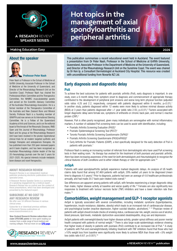 This publication summarises a recent educational event held in Auckland. The event featured a presentation from Dr Peter Nash, Professor in the School of Medicine at Griffith University, Queensland, Associate Professor in the Department of Medicine at the University of Queensland, and Director of the Rheumatology Research Unit on the Sunshine Coast. The event was chaired by Dr Ken Ip, a Consultant Dermatologist at Auckland City Hospital.