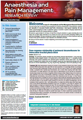 This Review features key medical articles from global anaesthesia journals with commentary from Dr John Barnard. The Review covers topics such as epidural anaesthesia, inhalational anaesthetics, intravenous opioid analgesics, muscle relaxants, neuromuscular blocking drugs and intravenous reversal agents.